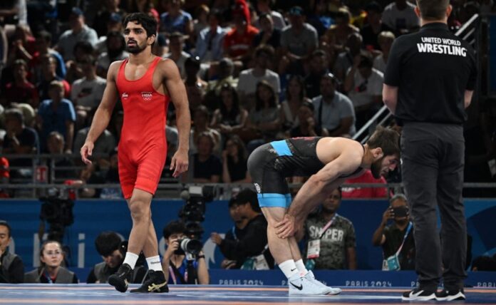 Younger Indian grappler Aman Sehrawat rekindled India’s hopes of a medal in wrestling, demolishing former world champion Zelimkhan Abakarov of Albania by technical superiority to seal a spot within the 57kg free-style semifinal on the Paris Olympics right here on Thursday. Aman was in imperious kind as he toyed with Abakarov within the second spherical. The 21-year-old India locked his legs at first of the second spherical and turned him over a number of instances to earn eight straight factors to safe a 12-0 victory.