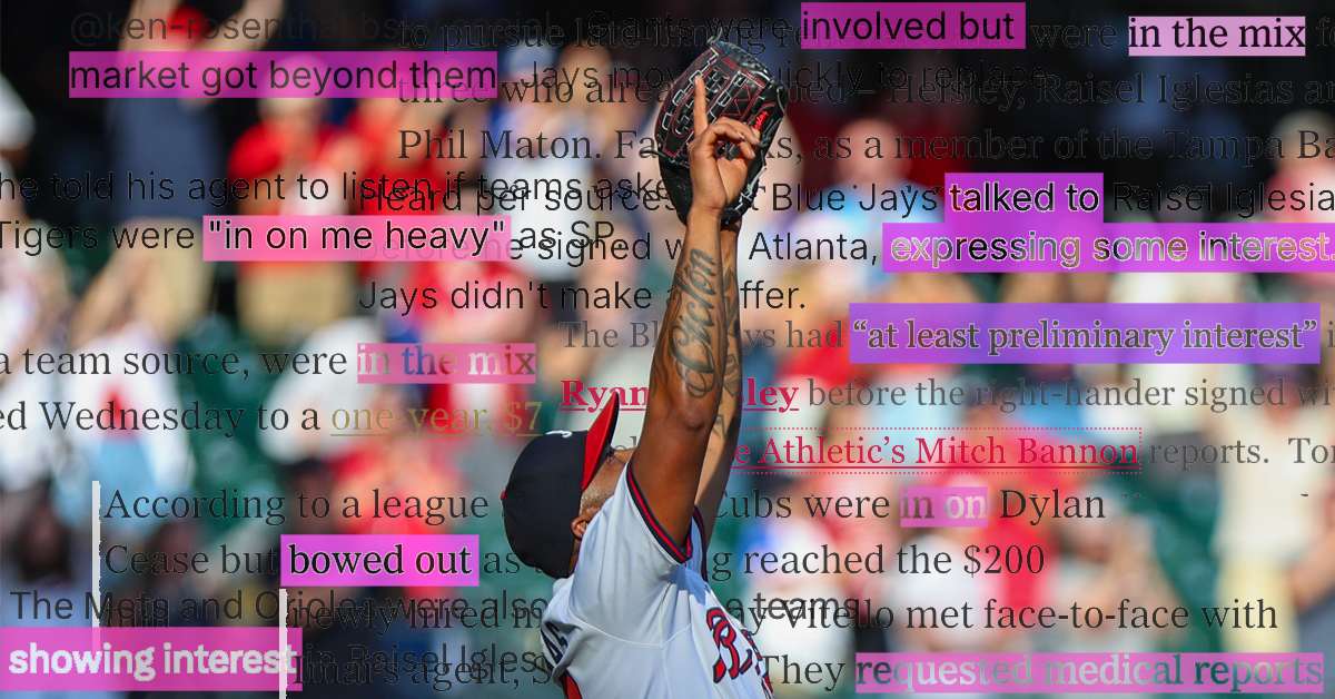 Extra will definitely come. Raisel Iglesias is at present main the pack with 4 We Trieds, however don’t be shocked if Ryan Helsley overtakes him. A number of stories stated that totally half the groups within the league had been considering Helsley, however we solely have two precise We Trieds thus far, and one got here from Helsley himself. Helsley informed reporters that the Tigers had been notably considering signing him as a beginning pitcher, which isn’t a shock, however his phrasing was notably enjoyable. He stated the Tigers had been “in on me heavy.” Truthfully, I don’t have any jokes right here. It’s only a barely odd grammatical building that I’ll in all probability take into consideration twice a day for the subsequent few years of my life. Earlier than this week, you possibly can be in on one thing. You could possibly perhaps even be closely in on it. However now you will be in on it…heavy. Generally language evolves similar to lifeforms, one mutation at a time.